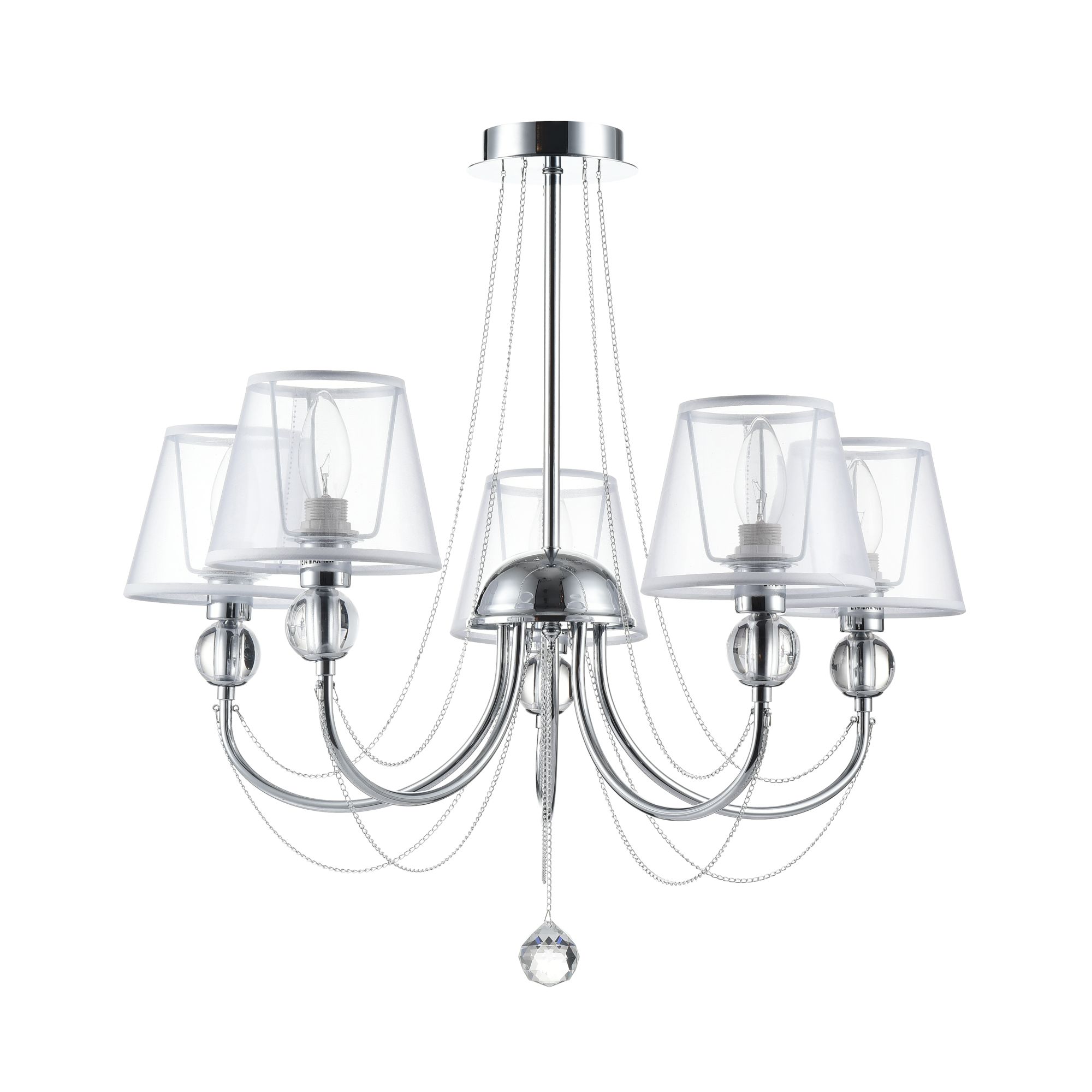 Светильники станут украшением интерьера, придадут ему шарм. Арматура светильников - из металла, а абажуры – из прозрачной органзы и ПВХ. Каждый из светильников серии дополнен тонкими серебристыми цепочками, а основания рожков украшены стеклянными прозрачными шарами. Завершающий элемент дизайна светильников Beverly – это декоративные подвески.