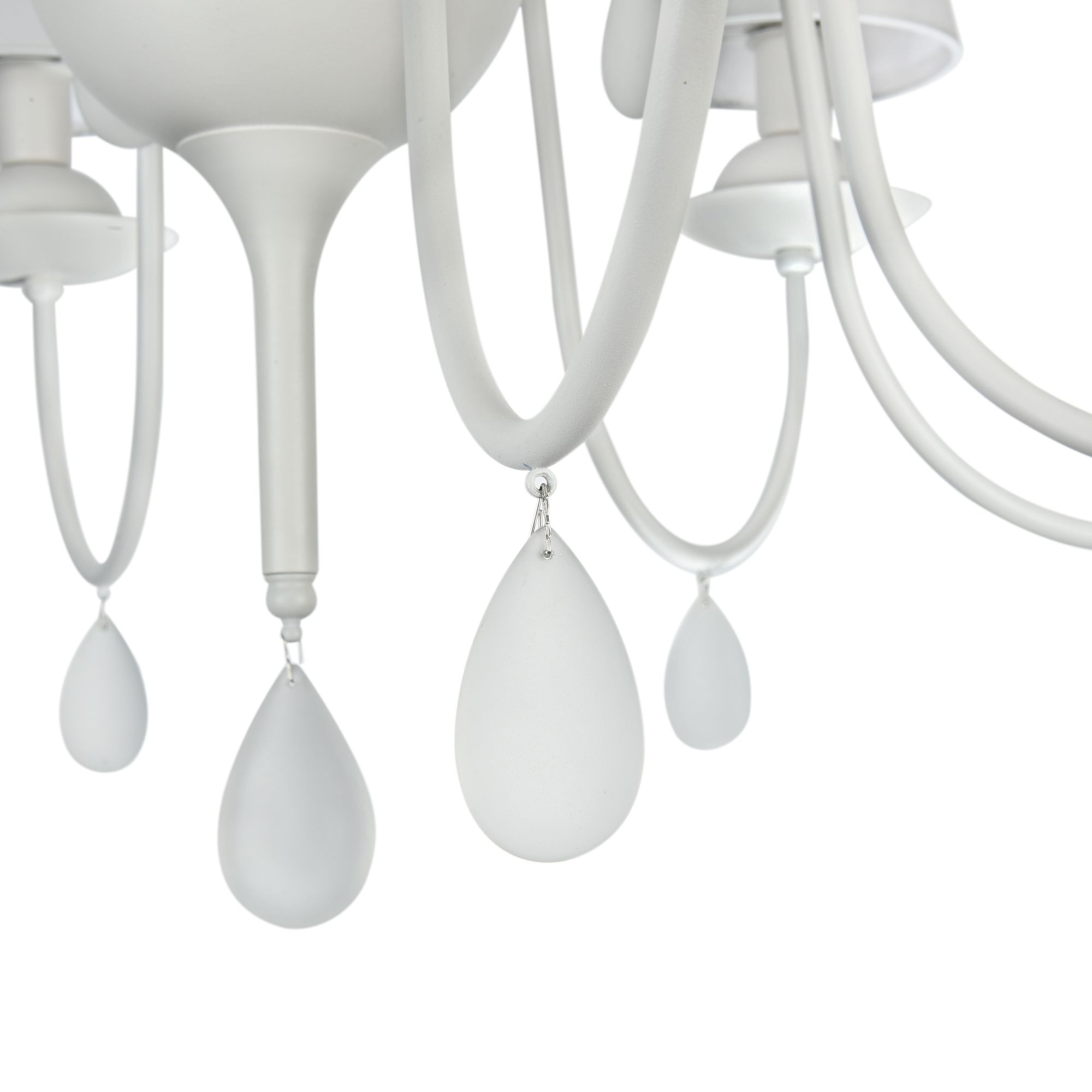 Дизайн светильников – это дуэт вечной классики и высоких технологий. Арматура и абажуры выполнены в приятном для глаз теплом белом цвете. Абажуры сделаны из ПВХ и ткани, а арматура - из стекла и металла. Светильники украшены декоративными стеклянными подвесками в виде капель.