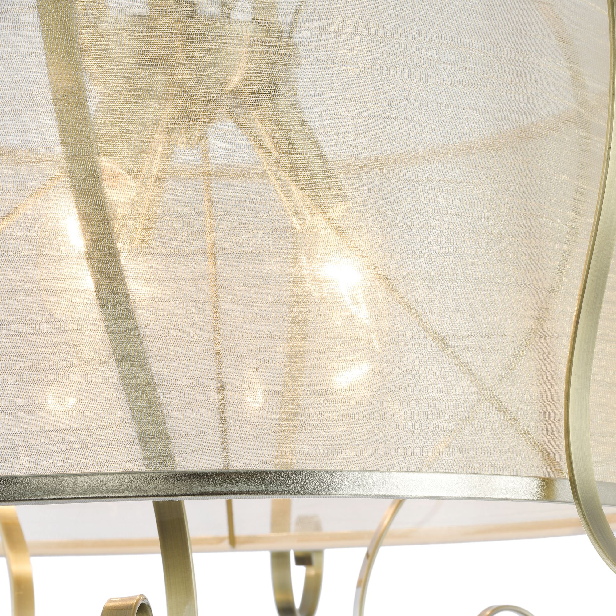 Абажуры и арматура светильников выполнены в разных цветах, с несколькими видами арматуры. Основание люстры украшено стеклянным декоративным элементом, а завитки рожков украшают подвески.